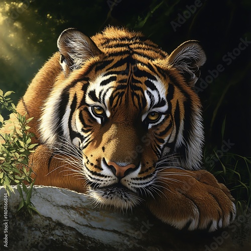 Fototapeta premium Fierce tiger with intense gaze resting peacefully in the jungle high...