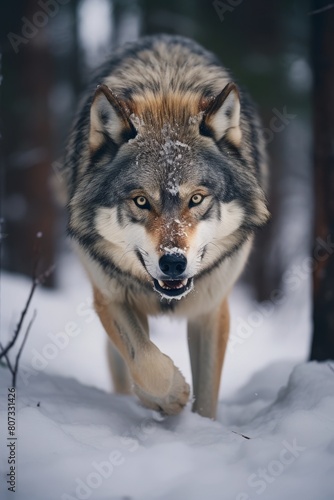 Naklejka premium Fierce wolf in snowy forest