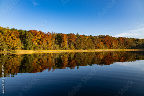 © KRASICKI Stanisław, Fototapeta premium Fiery Autumn Lake Reflection, Brilliant autumn foliage mirrored in calm lake waters, displaying vivid gold, orange, and red hues under a clear, crisp sky