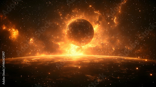 © cris, Fototapeta premium Fiery celestial body rising over a planet
