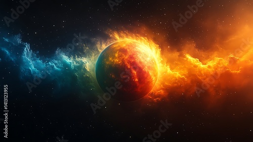 © Ibnu, Naklejka premium Fiery celestial sphere amidst cosmic nebulae.