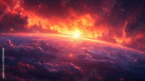 Fototapeta premium Fiery Celestial Sunrise: A Breathtaking Cosmic Landscape