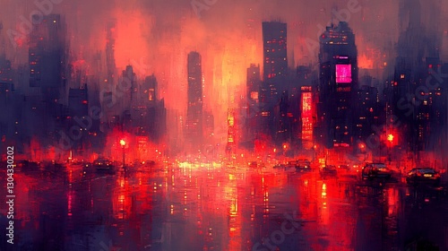 Fototapeta premium Fiery city skyline reflects in rain-slicked streets glowing red and pink at...