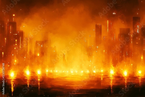 © c80, Fototapeta premium Fiery cityscape at dusk with vivid flames and smoke highlighting the skyline