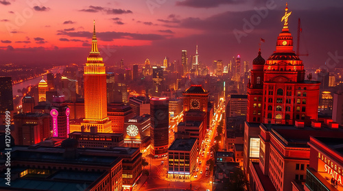 © Dlomiro, Fototapeta premium Fiery Cityscape at Sunset A Dramatic Urban Panorama