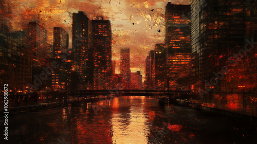 Obraz premium Fiery Cityscape: Post-Apocalyptic Urban River at Dusk