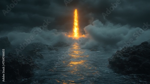 Obraz premium Fiery column ascends stormy seas