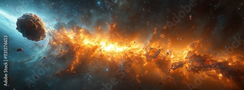 Fototapeta premium Fiery cosmic collision, asteroid impact, nebula explosion, space debris,...