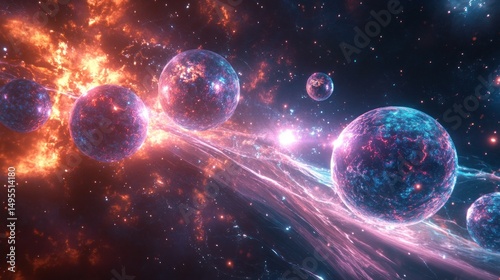 Obraz premium Fiery cosmic explosion with glowing planets and nebula.