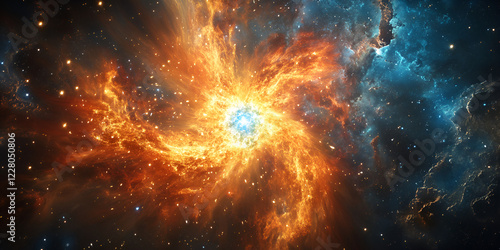 Fototapeta premium Fiery cosmic explosion with swirling nebula and glowing energy, Stunning deep space formation with bright celestial core