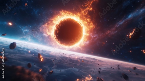 Obraz premium Fiery cosmic ring, celestial event, space rocks, burning sun, fiery nebula,...