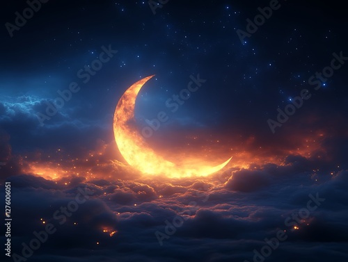 Fototapeta premium Fiery Crescent Moon Above a Sea of Clouds and Stars