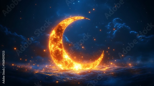 Obraz premium Fiery Crescent Moon Over Dark Night Ocean