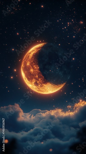 Fototapeta premium Fiery crescent moon over night clouds