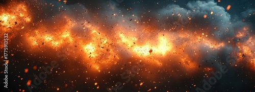 © Tamara, Naklejka premium Fiery explosion of debris and dust particles against a dark, cloudy sky background