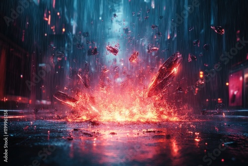 © atik, Naklejka premium Fiery explosion, raining shards, city night.
