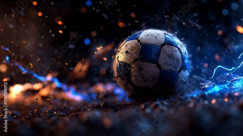 Fototapeta premium Fiery Football Showdown: A Dramatic Close-Up of a Worn Soccer Ball Amidst Sparks and Blue Energy