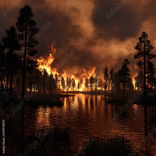 © Plake, Obraz premium Fiery Forest Fire Reflecting on Still Lake