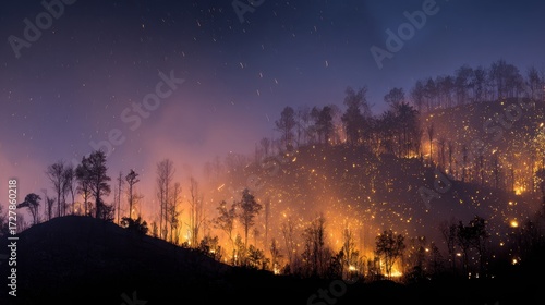 Fototapeta premium Fiery Forest Inferno - Dramatic Nighttime Wildfire Blaze Illuminates...