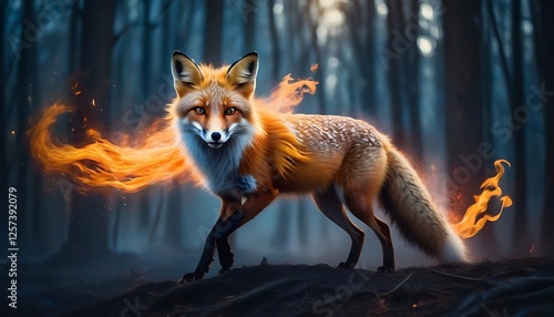 © DexaStd, Obraz premium Fiery Fox in Enchanting Forest: A Digital Painting of Mystical Creature