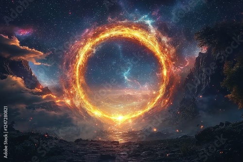 © Image Tree, Obraz premium Fiery glowing portal in a mystical landscape under a stormy sky.