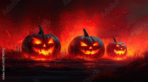Fototapeta premium Fiery Halloween jack-o'-lanterns glow brightly in a dark field. Perfect for spooky season designs, Halloween cards, or websites.