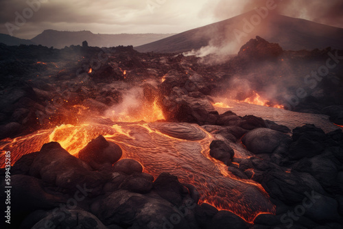 Fototapeta premium Fiery Hellscape Volcanic Landscape with Streams of Molten Lava and Billowing...