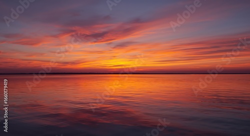 Fototapeta premium Fiery Horizon. A Breathtaking Sunset Over Tranquil Waters, Painting the Sky...