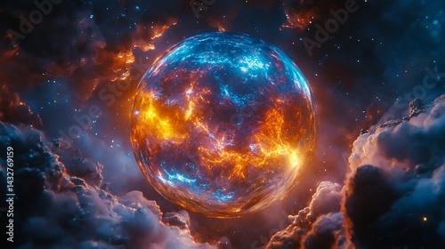 © Liliant, Obraz premium Fiery, icy orb glows amidst cosmic clouds