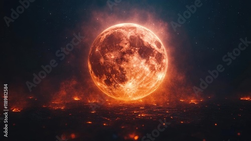 © Sri, Fototapeta premium Fiery Infernal Moon over Glowing Cityscape at Night