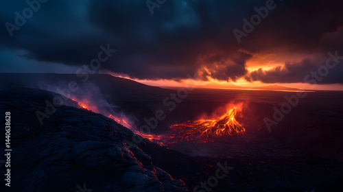 © Fonlinepix, Fototapeta premium Fiery lava eruption under a dark sky with a glowing horizon in the distance.