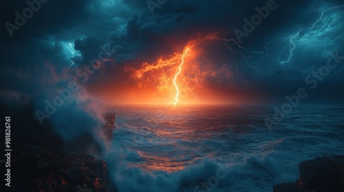 © loxia stock image, Obraz premium Fiery Lightning Storm Over the Sea