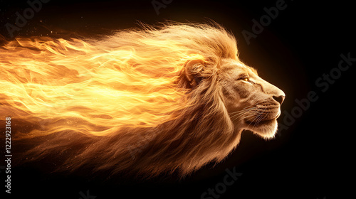 © Phasathon, Fototapeta premium Fiery lion spirit abstract visuals dynamic imagery dark background side view strength and power concept