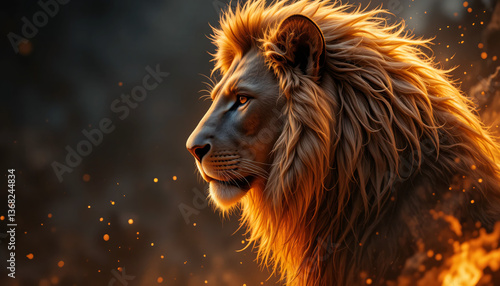 © Auyob Masih, Naklejka premium Fiery Mane Lion in a Dramatic Profile View with Glowing Embers and Dark Background