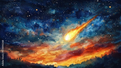 Fototapeta premium Fiery Meteor Streaking Across A Starry Night Sky Watercolor Painting