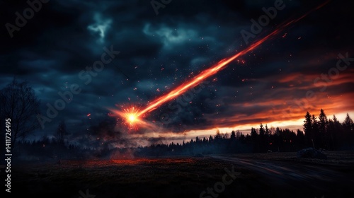 © zuni, Obraz premium Fiery meteor streaks across a stormy night sky over a forest