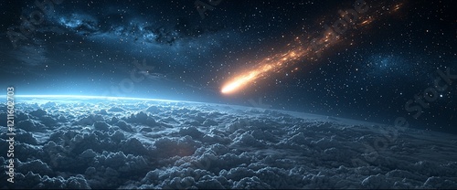 © ABIDZAR ALFAREZ, Fototapeta premium Fiery meteor streaks across night sky over planet.