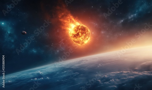 Obraz premium Fiery meteoroid hurtling towards planet.