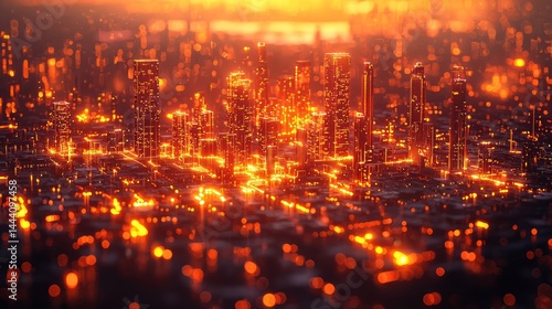 © Pampam, Fototapeta premium Fiery Metropolis: A futuristic city glowing with incandescent energy at night.