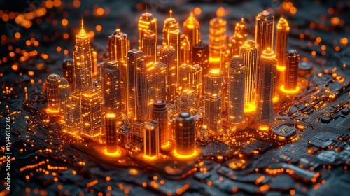 Fototapeta premium Fiery Metropolis on a Circuit Board