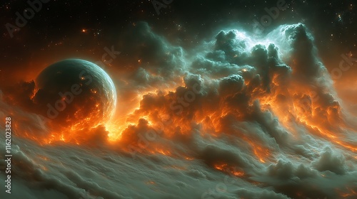 © gingsulku, Fototapeta premium Fiery Nebula Planet Cosmic Cloudscape Dramatic Space Scene