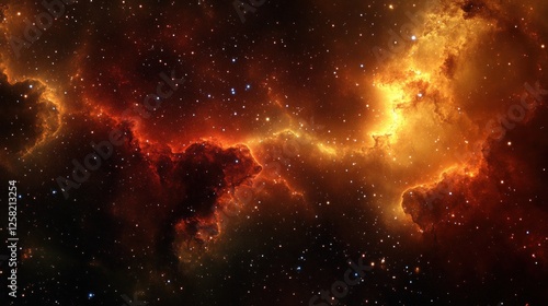 © Formasi, Naklejka premium Fiery nebula with orange and red cosmic clouds, stars.