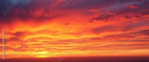 Obraz premium Fiery orange and purple clouds blaze across a vast, vibrant sunset sky, calm,...