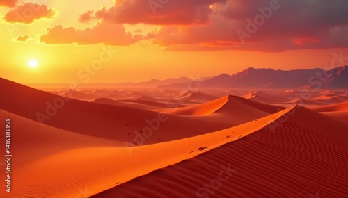 Fototapeta premium Fiery orange hues paint vast dunes, distant mountains silhouetted , horizon, desert sunset, background
