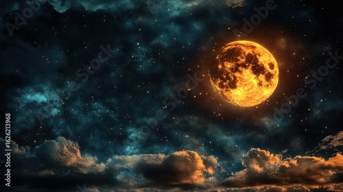 Obraz premium Fiery orange moon, night sky, clouds