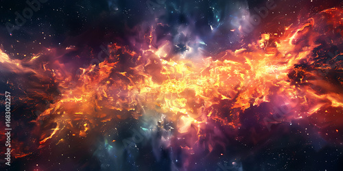 Obraz premium Fiery orange nebula across dark starry cosmos with swirling purple blue...