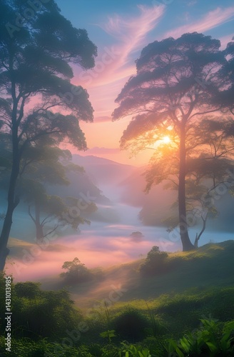 Fototapeta premium Fiery orange sunlight paints a breathtaking landscape of mountains, forest,...
