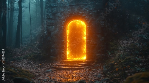 © siyons, Obraz premium Fiery Portal Beckons Within A Misty Forest