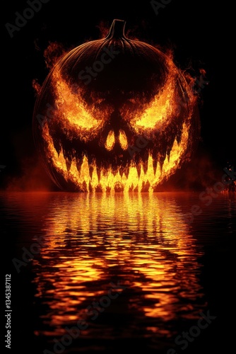 © retno, Fototapeta premium Fiery pumpkin face reflected in water