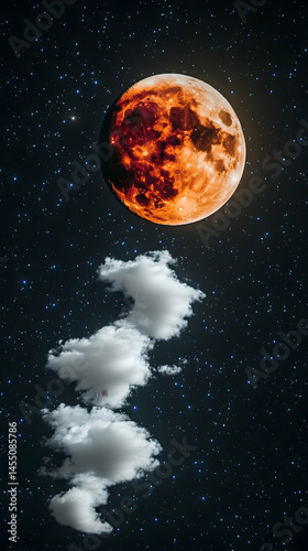 Fototapeta premium Fiery red celestial body hangs above a whimsical cloud formation resembling a...